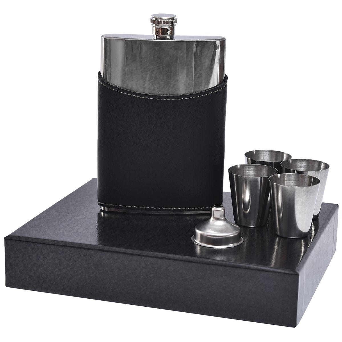 Constructed with high-quality stainless steel, the flask is wrapped in handsome man-made leather, offering both durability and sophistication. The set includes four stainless steel shot glasses, making it ideal for sharing a drink with friends or family.
