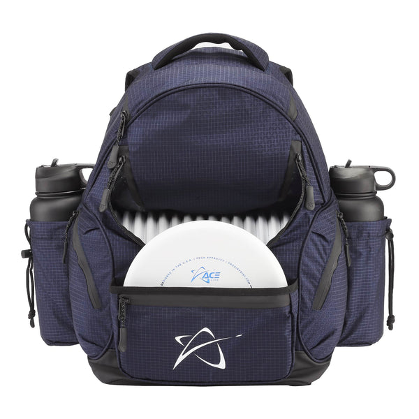 The main compartment accommodates 17-18 discs, while a dedicated putter pocket holds an additional two putters. An extra top pocket allows for storage of snacks or a small accessory.