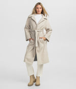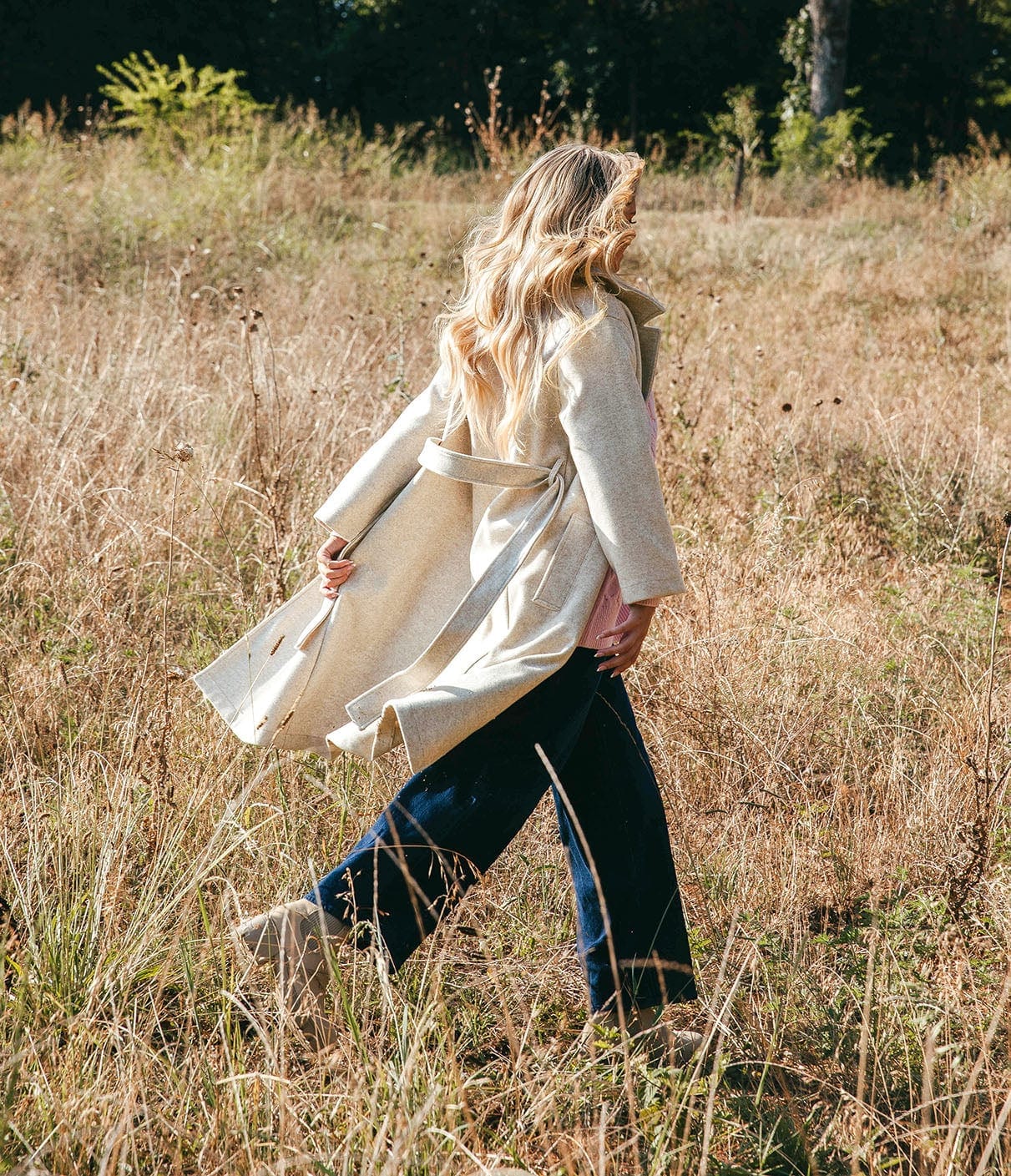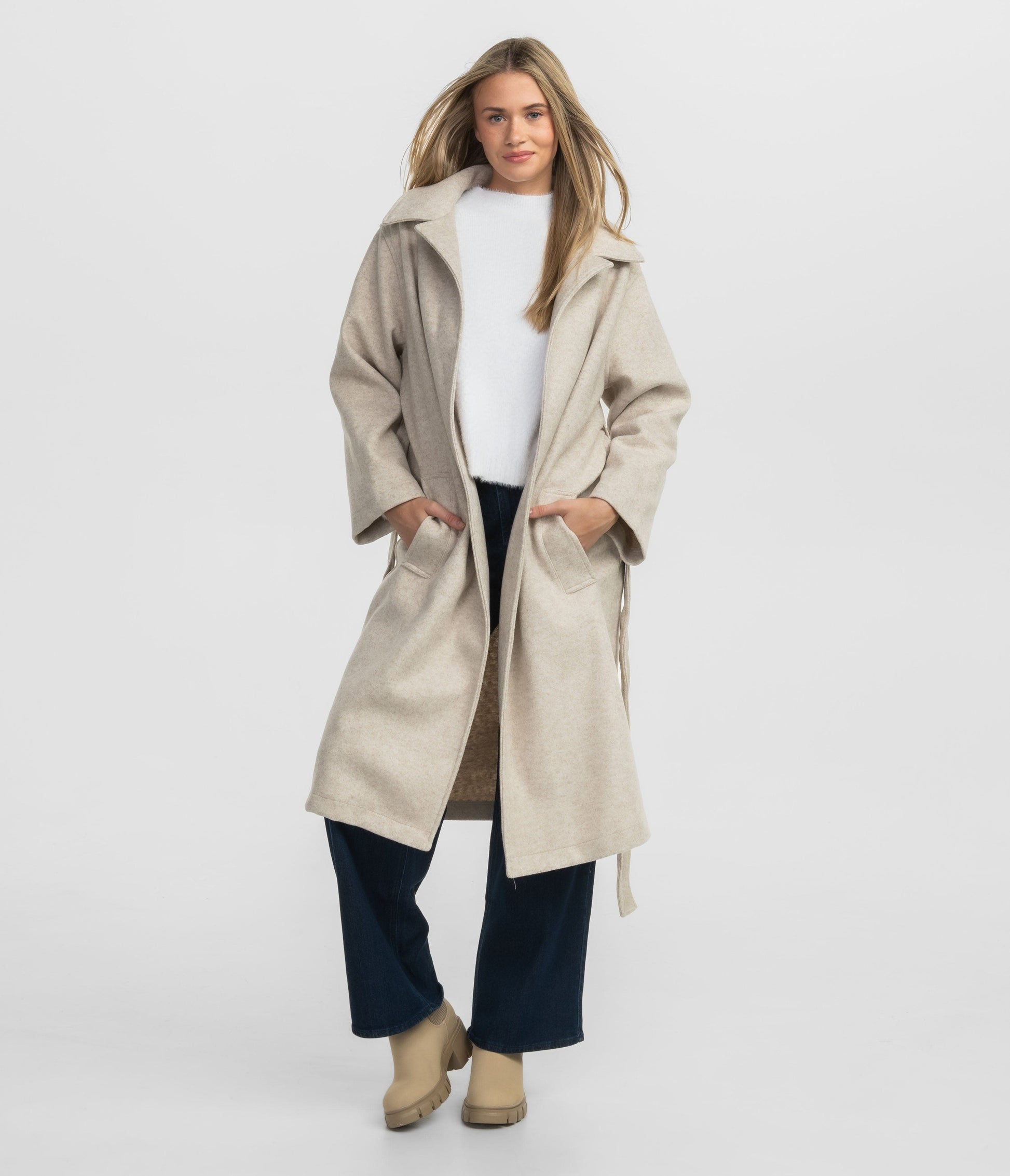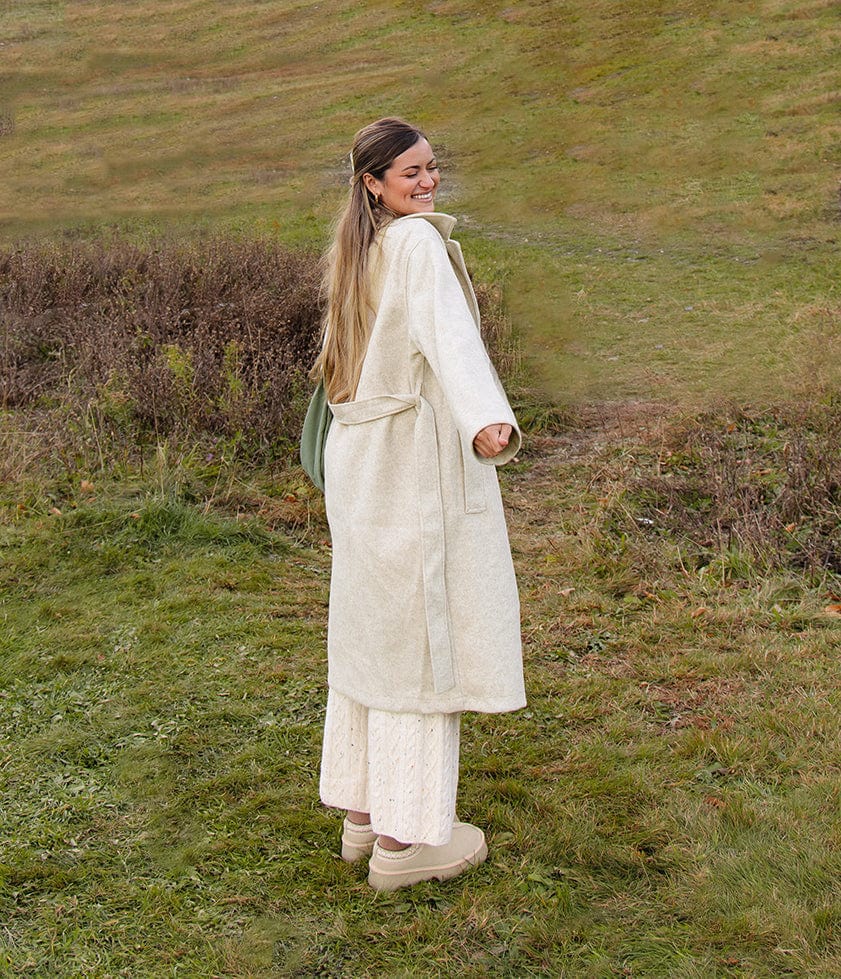The tie waist creates a flattering silhouette, making it a versatile piece for any wardrobe. Its oatmeal hue is a perfect neutral, effortlessly complementing various outfits and occasions.