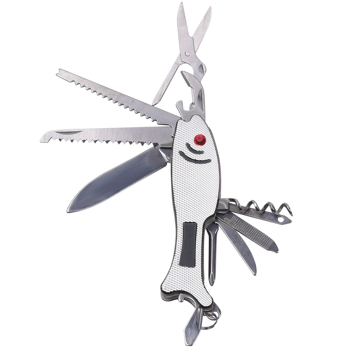 - Includes a bottle opener, corkscrew wine opener, Phillips head screwdriver, scissors, and various fishing knives/blades.