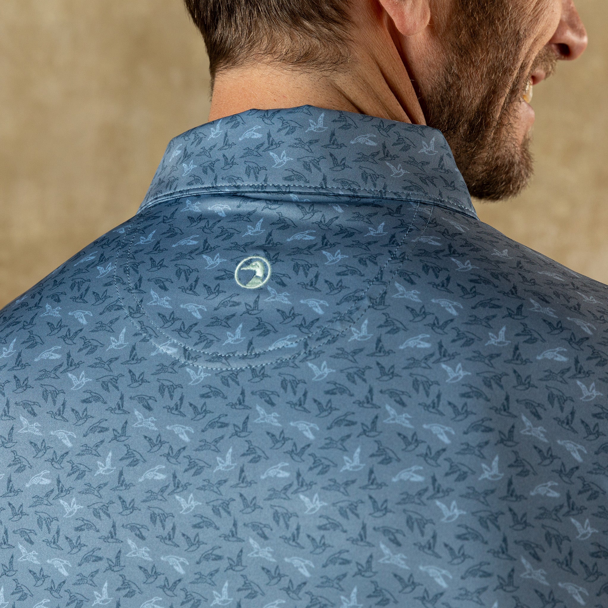 The Long Drive Performance Polo in Chambray Blue is designed for those who appreciate both style and functionality in their wardrobe. This polo features a unique Wingbeat Print that adds a touch of flair to its classic design.